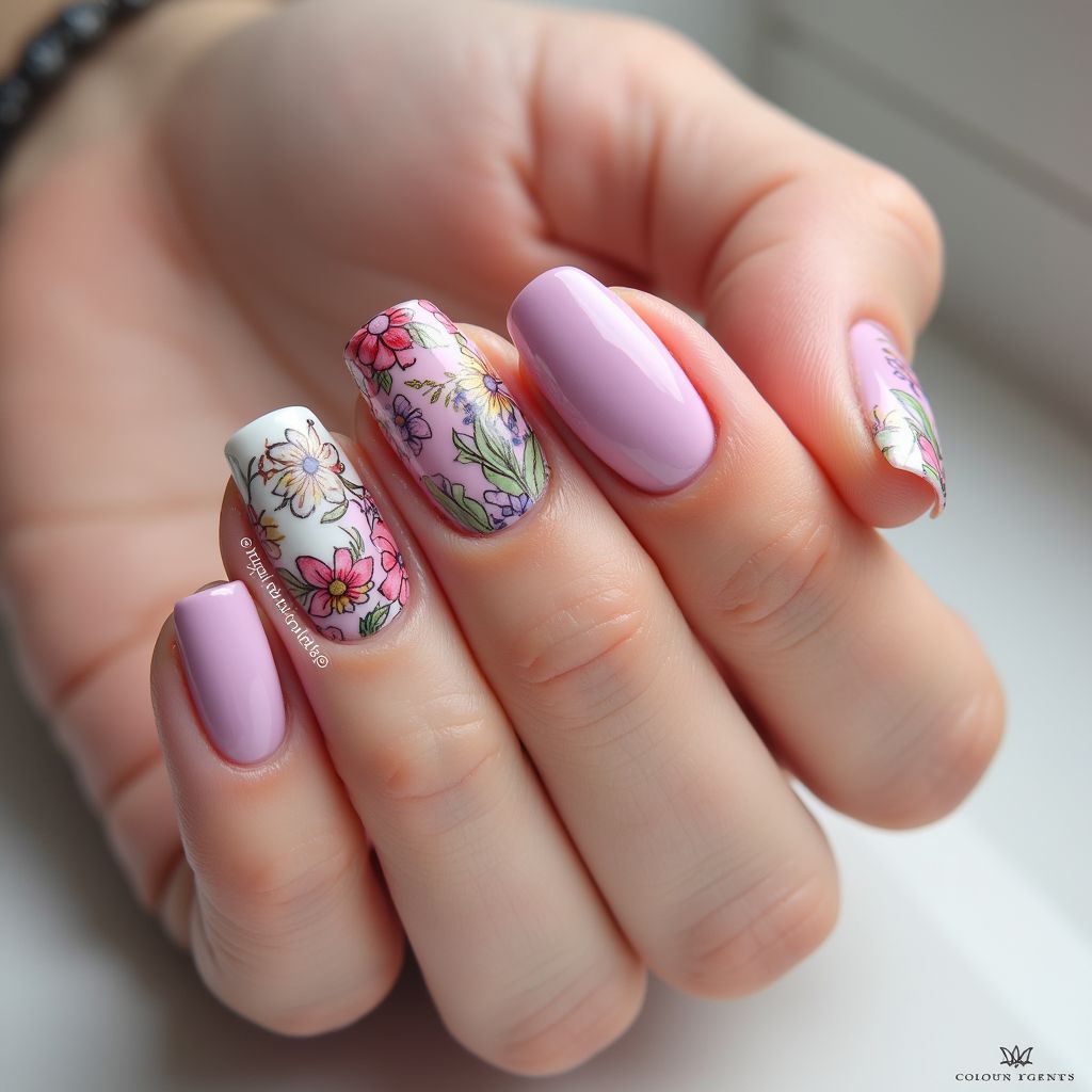 3The floral design incorporates soft pinks, yellows, greens, and purples over a white or pale pink background, while the solid nails are painted with a complementary pastel purple.